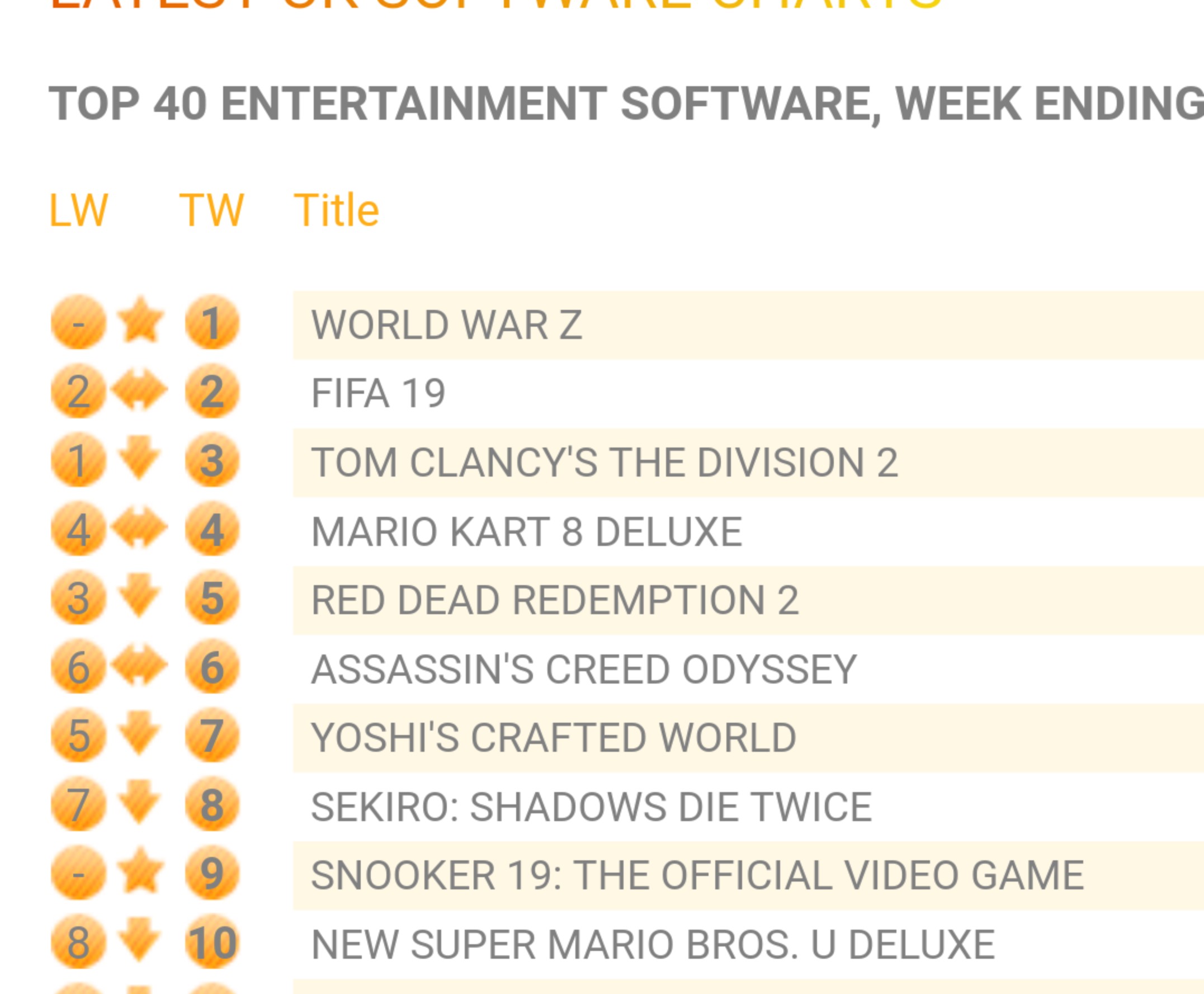 ظهرت اليوم القائمة الاسبوعية الخاصة بالمبيعات البريطانية حيث شهدت قائمة هذا الاسبوع تغييرا ملحوظا و مفاجئا في ترتيب مبيعات الالعاب, تأتينا في الصدارة لعبة World War Z متغلبة على المتصدر السابق لعبة The Division 2, اليكم ادناه القائمة الكاملة.