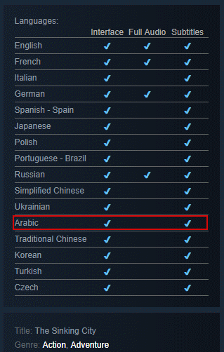 كما تشاهدون في الصورة التي التقطناها لكم من صفحة اللعبة على Steam تظهر انها ستدعم اللغة العربية من بين اللغات التي ستتواجد في اللعبة و سيكون الدعم على شكل ترجمة للقوائم و ايضا ترجمة للحوارات و لكن لن يكون هناك دبلجة صوتية كما هو الحال مع بعض اللغات الاخرى.