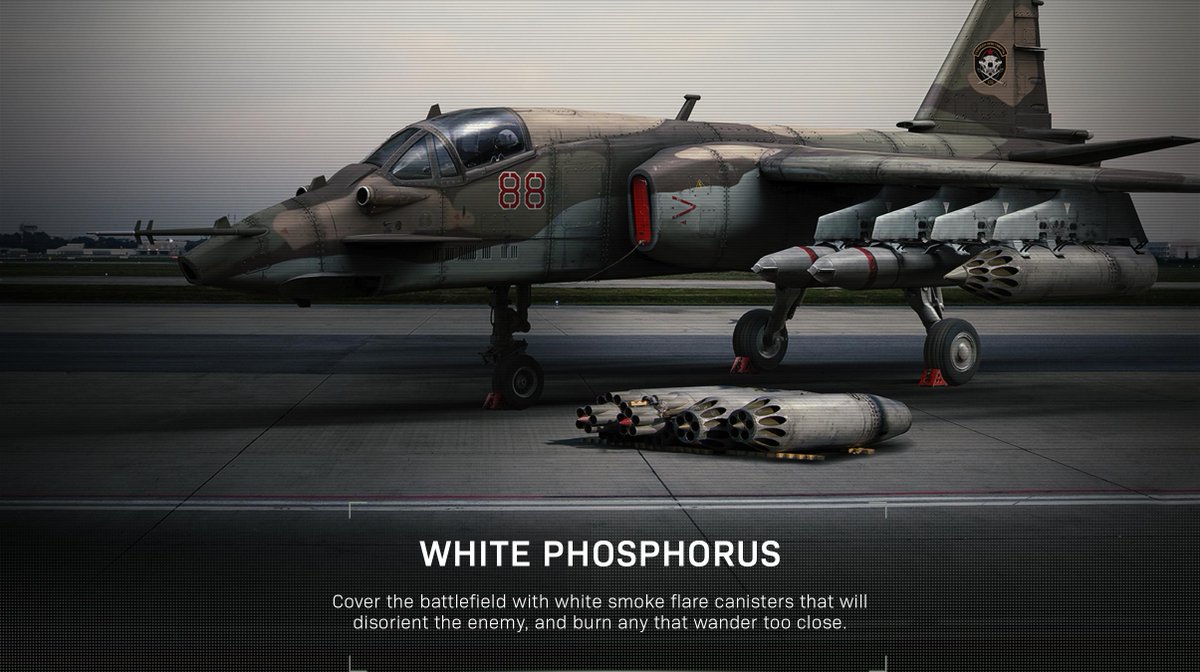 اما الـ killstreaks الثالث و الاخير الذي تم الكشف عنه اليوم هو قنابل الـ White Phosphorus و هي قنابل تصدر دخان ابيض اللون يتم اسقاطها من طائرة يحدد اللاعب مسارها على الخريطة و يمكن لهذا الدخان المنبعث من هذه القنابل جعل اللاعبين مشتتين و يفقدون تركيزهم كما انها ستترك اثر حروق على اجسادم و الذي سيتسبب في ضرر و يزيد فرصة القضاء عليهم.