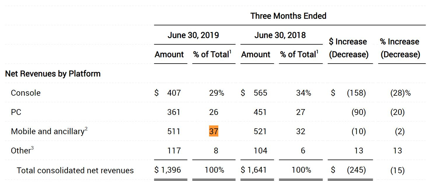 لم تقم Activision بإطلاق العديد من الألعاب على الحاسب الشخصي والكونسولز هذا العام، بالحقيقة إطلاقاتها الضخمة كانت Sekiro: Shadow Die Twice التي قامت ببيع 3.8 مليون نسخة حول العالم ولعبة Crash Team Racing Nitro-Fueled التي أيضاً حققت مبيعات ضخمة. بالتأكيد لن ننسى لعبة Call of Duty: Modern Warfare القادمة في الأشهر القادمة، سوف ترتفع نسبة الأرباح بشكل كبير عندما تصدر اللعبة وربما سوف نرى تفّوق الكونسولز من ناحية الإيرادات.