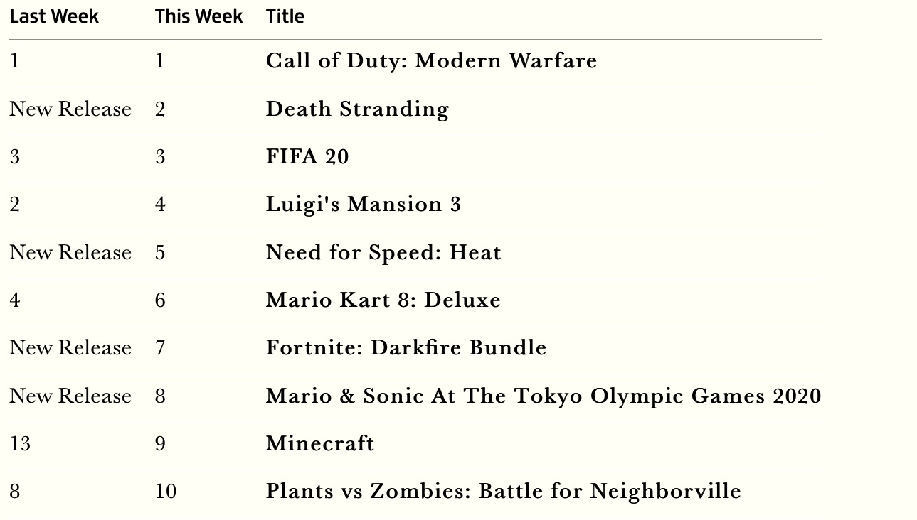 وكما نشاهد في الجدول أدناه فقد احتلت لعبة Need for Speed: Heat القادمة حديثاً المرتبة الخامسة، وهي واحدة من ثلاث ألعاب من إنتاج شركة EA موجودة على القائمة، فكما نلاحظ أن لعبة FIFA 20 احتلت المرتبة الثالثة، أما لعبة Plants vs Zombies: Battle for Neighborville احتلت المرتبة العاشرة. كما نلاحظ استحواذ لعبة Nintendo الجديدة للعبة Mario & Sonic At The Tokyo Olympic Game، على المرتبة الثامنة.
