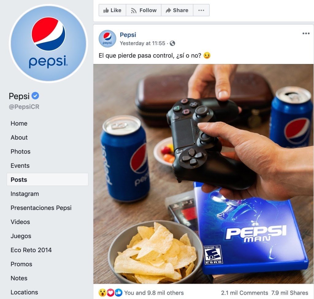 حسابات شركة PEPSI بجميع افرعها تقريبا على موقع فيس بوك قامت بنشر منشور موحد الجمل و الصور يمكنكم مشاهدته ادناه, المنشور كان عبارة عن صورة لذراع تحكم جهاز البلايستيشن 4 يقبع اسفل هذه الذراع صورة لغلاف لعبة بيبسي مان بنسختها المحسنة على ما يبدو, كما تشاهدون في الاسفل.