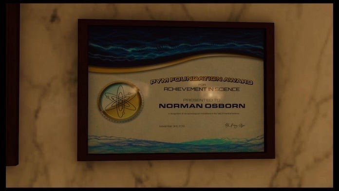 التلميح تجدوه في المهمة التي تجعلكم تدخلون بيت اوزبورن من خلال شخصية ماري جاين, و هناك ستجدون اللوحة الموجودة في الصورة اعلاه, هذه اللوحة تم منحها لشركة اوزبورن من قبل منظمة الرجل النملة لتفوق الاول في العلم, و طبعا الجميع يعلم ان الرجل النملة هو شخص ذكي و عالم في علوم الذرة من خلال ما رأيناه في سلسلة الافلام.