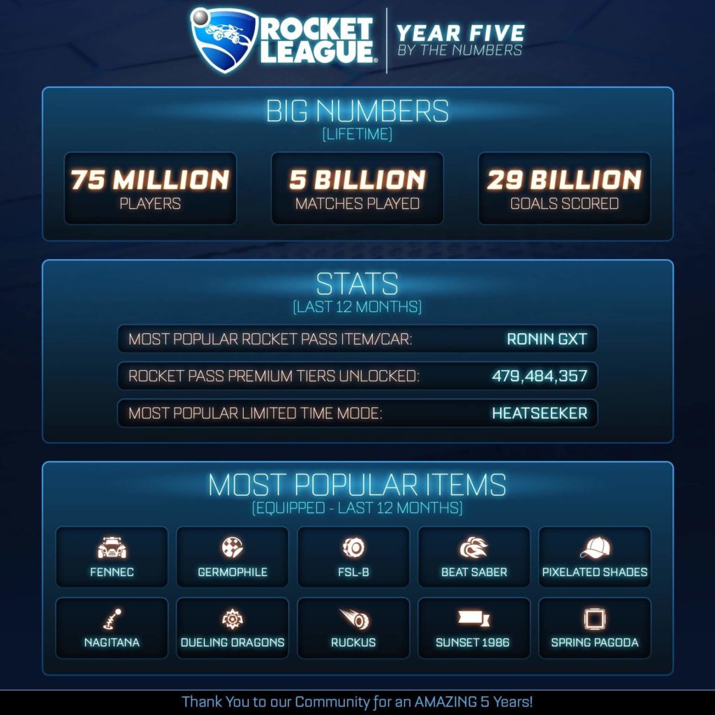 للاحتفال بهذه المناسبة، تم مشاركة إحصائيات اللعبة المختلفة على حساب Rocket League الرسمي على تويتر. ضمن هذه الإحصائيات، علمنا أنّ خمسة وسبعين مليون لاعب قام بتجربتها وتم لعب خمسة مليار مباراة وتم تسجيل تسعة وعشرين مليار هدف ضمن هذه المباريات. بجانب ذلك، حصلنا على معلومات أضافية مثل أنّ في آخر إثنى عشرة شهراً، طور Heatseeker كان أنجح طور محدود وتم مفتح 479,484,357 مرتبة في روكيت باس (مثل بطاقة المعركة) المدفوعة. ادناه يمكنكم رؤية المزيد من الإحصائيات حول العناصر الأكثر استخداماً.