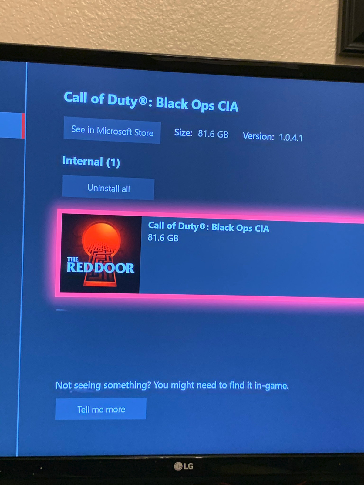 من خلال تسيربات متجر اكسبوكس الاخيرة ظهرت اللعبة مرة اخرى ولكن هذه المرة مع تفاصيل جديدة حيث في البداية ظهر ملف اللعبة تحت اسم Red Door وبحجم 81 جيجا على عكس حجم الملف على متجر بلايستيشن والذي بلغ 71 جيجا حينها, الامر الملفت هو ان احد المستخدمين تمكن بطريقة او بأخرى من تحميل الملف على جهاز اكسبوكس وان حيث تحول اسمة الى Call of Duty Black Ops CIA كما تشاهدون في الصور.
