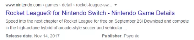 يأتي لنا هذا التسريب من صفحة اللعبة على متجر نينتندو للسويتش. وفقاً للصفحة التي تم حذفها الآن، ستصبح لعبة Rocket League مجانية الأسبوع القادم وتحديداً في الثالث والعشرين من سبتمبر. استديو Psyonix المُطور لها لم يؤكد او يكشف عن التاريخ بعد إنما تسريب كهذا عادةً ما يكون صحيح. بالأسفل يمكنكم رؤية صورة تؤكد لنا ذلك من محرك البحث غوغل.