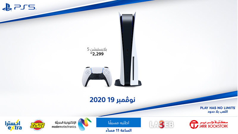 حساب بلايستيشن السعودية على تويتر اعلن عن فتح الطلب المسبق لجهاز بلايستيشن 5 من خلال خمسة متاجر معتمدة داخل المملكة العربية السعودية وهذه المتاجر هي: