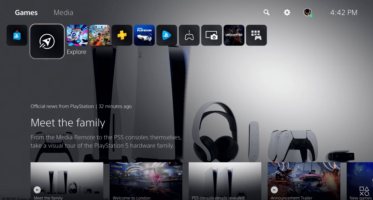 يوجد أيضاً تبويبة “الاستكشاف – Explore” التي يمكنك من خلالها معرفة كل أخبار البلايستيشن الجديدة بالإضافة إلى آخر تطورات الألعاب التي قمت بمتابعتها. للاسف الشديد لم تكشف سوني بعد عن متجر بلايستيشن 5 ولكنها أخبرتنا أنّه مدمج مع النظام وليس تطبيق منفصل كما على الجيل الحالي مما سيجعله أسرع وأفضل للاعبين كما نشاهد في الصورة بالاسفل.