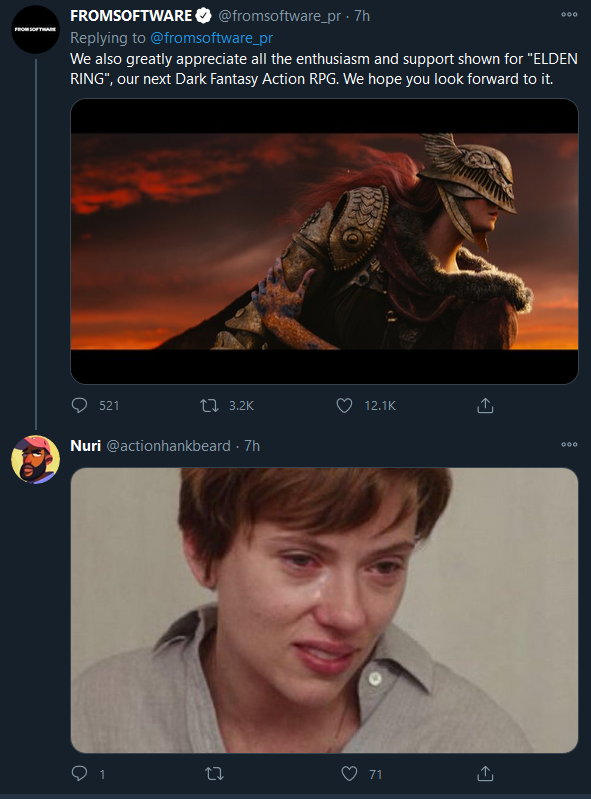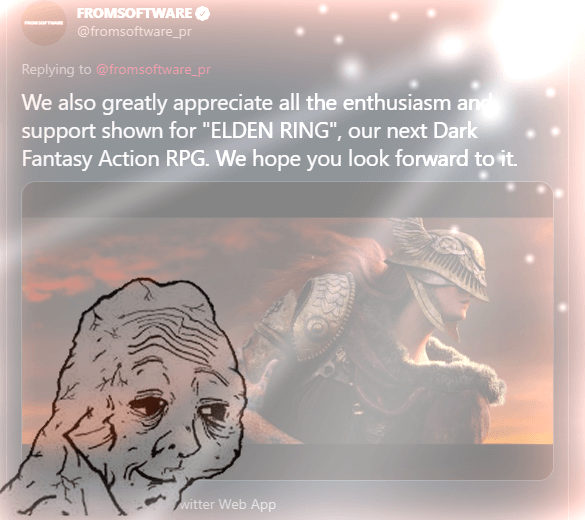 نحن ايضا نُقدّر بشدّة كل الحماس والدعم للعبة Elden Ring, لعبة الإثارة ولعب الأدوار المظلمة التي نعمل عليها, نأمل أن تكونوا متشوقين لتجربتها.