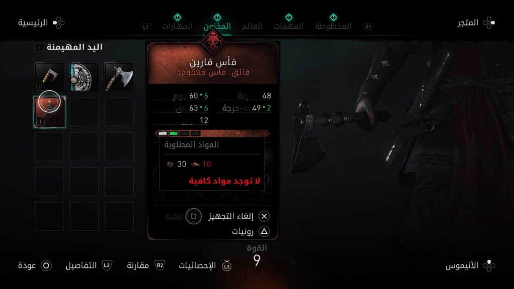 في الجزء السابق، أدويسي، دائماً ما كنا نغير الأسلحة والدروع بشكل مستمر خاصةً بسبب وجودهم بكل مكان إنما في Assassin’s Creed Valhalla، سيبقى عتادك لمدة أطول. كل سلاح وكل درع قابل للترقية لأكثر من مرة، في كل مرة تقوم بترقيته سوف تزداد قوته.