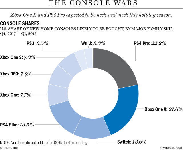 حرب المنصات، هكذا عنونت مؤسسة IDC دراستها و التي تقول بأن جهاز البلايستيشن 4 برو و رغم ضعفه سيتفوق على اقوى جهاز منزلي على الإطلاق الإكس بوكس وان اكس في موسم الأعياد القادم نهاية هذا العام، و سيكون فارق التفوق بسيطا جدا.