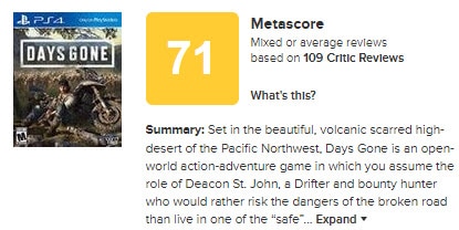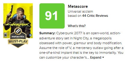 اليكم هنا صورة توضح تقييمات كل من لعبة Cyberpunk 2077 و لعبة Days Gone على موقع التقييمات العالمي ميتاكريتكس, قد يكون تقييم لعبة Cyberpunk 2077 غير نهائي بسبب عدم وصول مراجعات عدد كبير من النقاد حتى الان.