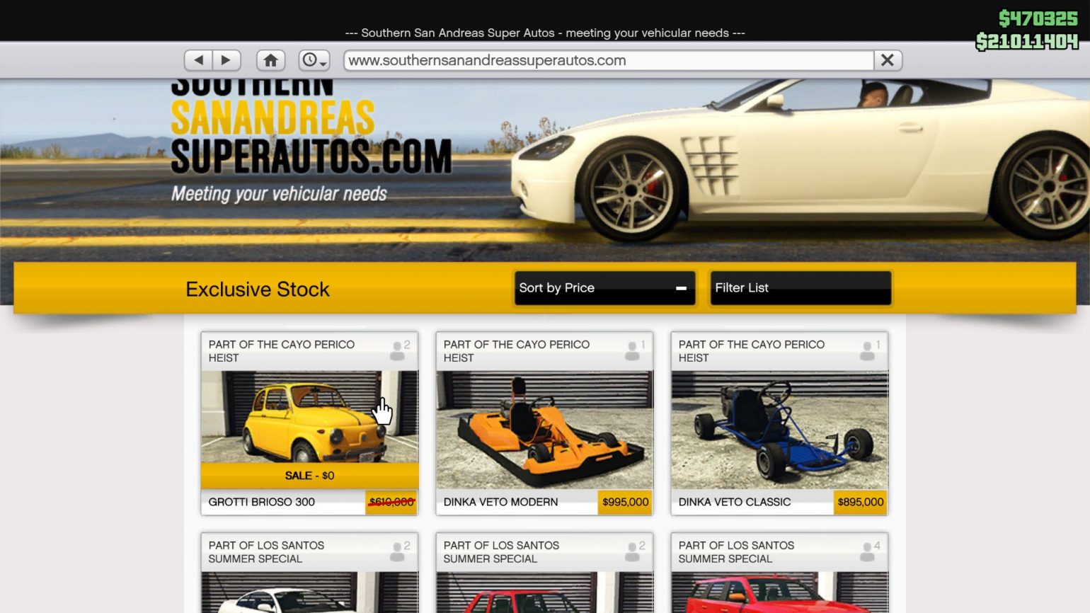 وإضافة الى كل ذلك هناك قائمة بالسيارات المجانية التي تستطيع الحصول عليها الان، وهناك إمكانية كبيرة من أجل الحصول على سيارة Progen Tyrus الخارقة والتي تبلغ قيمتها 2,550,000 دولاراً.