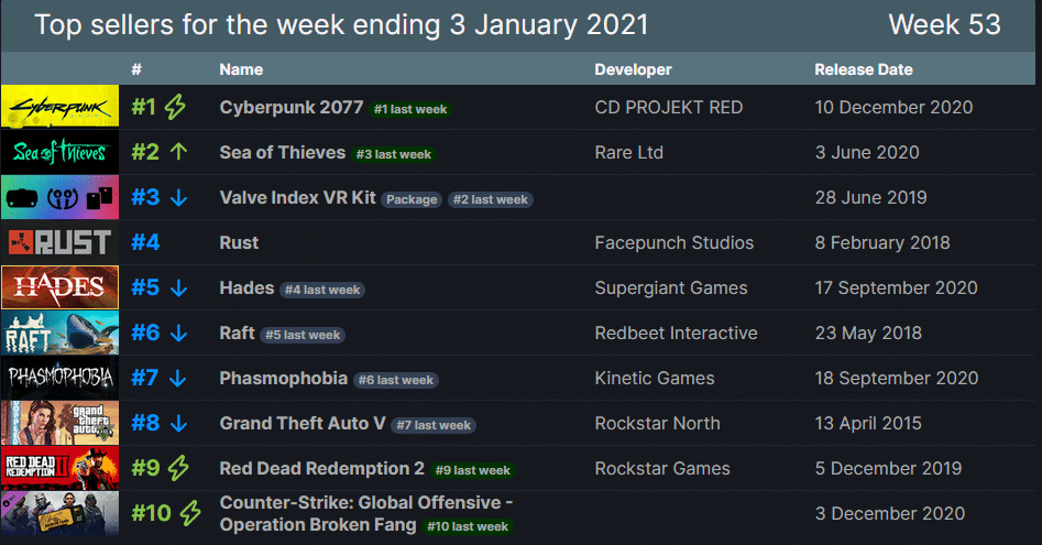 كما يظهر لنا موقع SteamDB وكما أشار المُحلل الشهير دانيل أحمد ايضا، لعبة Cyberpunk 2077 مازالت اللعبة الأكثر مبيعاً (وفقاً للأرباح) على متجر ستيم للأسبوع السابع على التوالي، أيّ من فترة الطلب المسبق قبل إطلاقها وهي متصدرة بالمركز الأول — وهو أمر مثير للاهتمام حقاً خاصةً بعد الكلام السلبي الذي واجهته اللعبة إنما كما قلنا أعلاه، اللعبة رائعة بدون شك.
