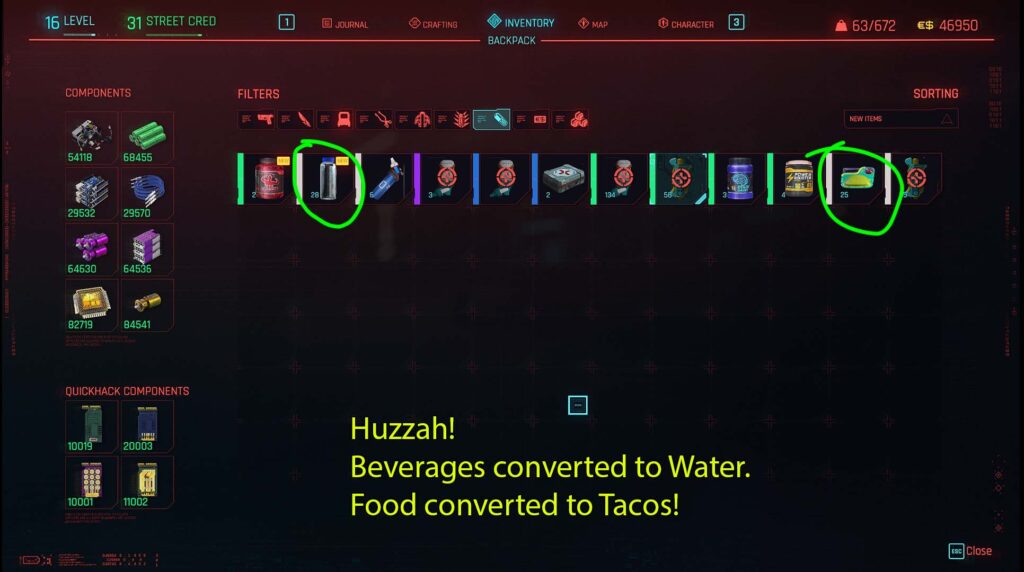 في Cyberpunk 2077، ستقوم بالكثير من النهب خاصةً في حال كنت تستكشف كل زاوية كما أفعل انا. هذا يعني أنك ستجمع العشرات من المشاريب والمؤكولات وستضيع بمخزونك وسيصعب إدارته. تعديل Simplified Beverages and Food من andwhat112 يساعدك على حل هذه المشكلة حيثُ يقوم ببساطة بجمع الطعام وتحويله إلى “تاكو” والمشروبات إلى ماء مما سيأخذ مكانان فقط بالمخزون. يمكنك أيضاً بيع المشروبات الكحولية بشل تلقائي او تفكيكهم للحصول على عناصر للصناعة.