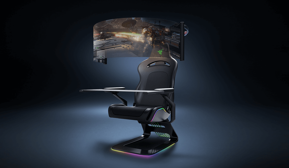 شركة Razer تعود مرةً أُخرى للقائمة مع كرسي Project Brooklyn من المستقبل. بالطبع هذا مجرد نموذج وقد لا يرى النور أبداً ولكن فكرته مثيرة للإهتمام بدون شك. هذا الكرسي الذي يبدوا كرسي عادي في البداية مميز للغاية حيثُ يوجد طاولة أمامك لوضع يديك والفأرة ولوحة المفاتيح بالإضافة إلى شاشة OLED بحجم 60 إنش (152.4 سم) تخرج من خلف رأسك! ما الذي تريده أكثر من ذلك من كرسي ألعاب؟ بالطبع هناك إضاءة RGB ومحركات للإهتزاز لتقديم تجربة غامرة وفتحات لتوصيل ملحقاتك.