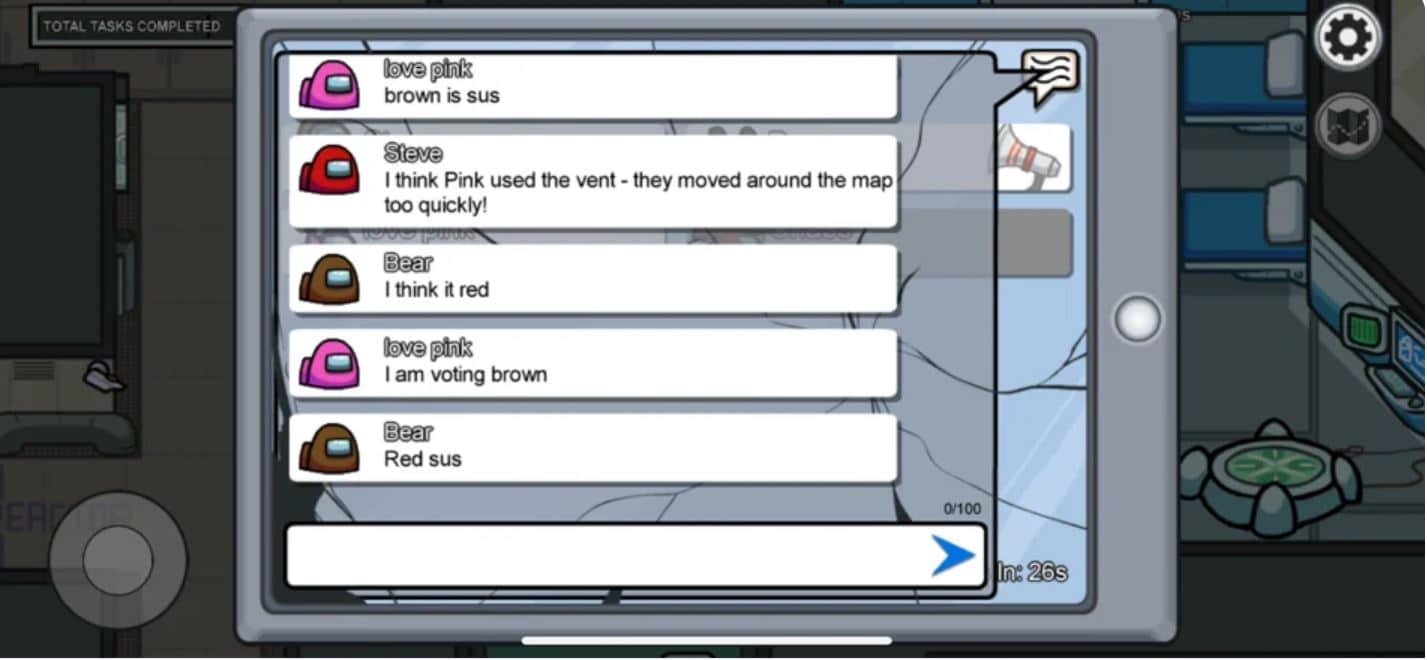 وعندما يكتشف أحد أعضاء الطاقم الجثة أو يشتبه في أحد ما على أنه محتال، يدخل جميع اللاعبين إلى غرفة دردشة نصية خاصة من جل مناقشة هوية المنتحل بينهم، ثم يصوت الجميع ويتم طرد اللاعب الذي يحصل على أكبر عدد من الأصوات، وإذا كانوا الذي تم التصويت عليه وطرده خارج السفينة هو المنتحل، فإن طاقم السفينة الفضاية سيفوز، وفي حال لم يكن محتال تستمر اللعبة، ويزداد القلق والتوتر والشك.