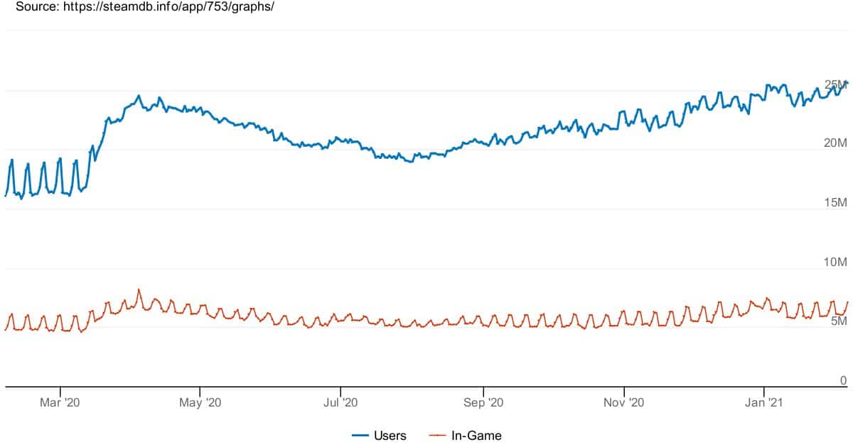 وأشرنا سابقاً الى أن الجائحة والإغلاق الإجتماعي على مستوى العالم بسبب فيروس كوفيد-19 لعب دوراً رئيسياً في زيادة عدد اللاعبين المتزامنين على منصة Steam في نفس الوقت.