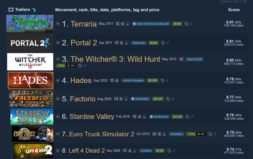 هذا إنجاز رائع بدون شك للعبة مستقلة ولكن هذا ليس الإنجاز الوحيد التي حققته اللعبة حيثُ أصبحت أيضاً الرقم واحد في قائمة Steam250 التي تحتوي على أفضل 250 لعبة على متجر ستيم بناءً على التقييمات الإيجابية. أيّ لا يهم إن كان هناك عشرة ملايين تقييم ولكن يجب أن تكون نسبة كبيرة جداً من هذه التقييمات إيجابية. كما يمكنكم رؤية ذلك بالقائمة ادناه، حالياً تجلس لعبة Terraria بالمركز الأول متفوقة على Portal 2 التي كانت بالمركز الأول لفترة طويلة جداً وعلى The Witcher 3 وعلى Hades التي وصلت إلى هذه القائمة بسرعة كبيرة.