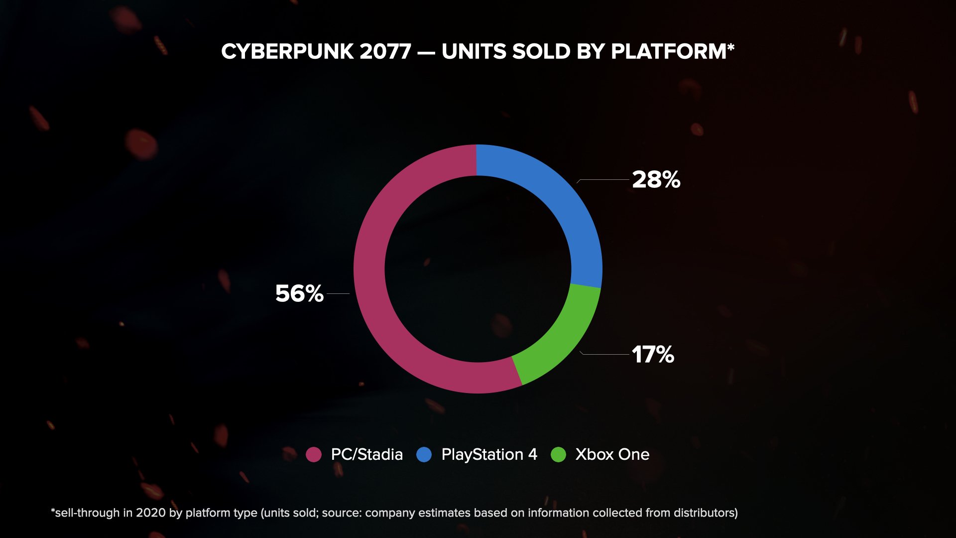 رغم الإطلاق السىء والشعور العام السلبي تجاه لعبة Cyberpunk 2077 إلا أنها تمكنت من بيع أكثر من 10.2 مليون نسخة حتى شهر ديسمبر 2020 الماضي فقط، ومؤخراً تم الإعلان أن مبيعات اللعبة وصلت الى أكثر من 13.7 مليون نسخة مباعة على جميع المنصات وذلك حسب ما ذكره بيوتر نيلوبوفيتش المدير المالي لأستديو CD Projekt  بينما بلغت أعداد النسخ المستردة للاعبين نحو 30 ألف نسخة فقط.