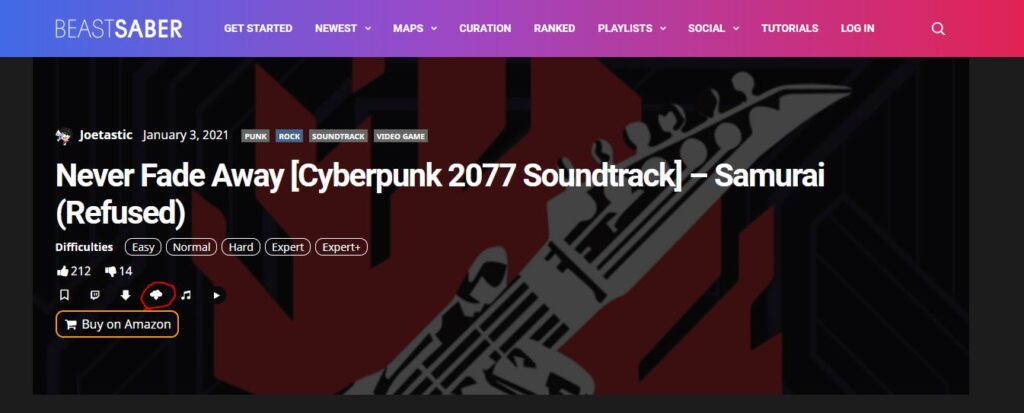 في حال كنت تريد تثبيت الخرائط / الأغاني من حاسوبك مباشرة وليس من داخل اللعبة، اذهب مرةً أُخرى إلى Mod Assistant ومن ثم إلى تبويبة “Options”. الآن اضغط على “Enable One Click Instals” واختر Beat Saber. بعد ذلك توجه إلى موقع Beast Saber واختر الأغنية التي تريدها من هناك، الآن كل ما تحتاجه هو الضغط على زر السحابة كما في الصورة وستثبتها الأداة بشكل تلقائي.