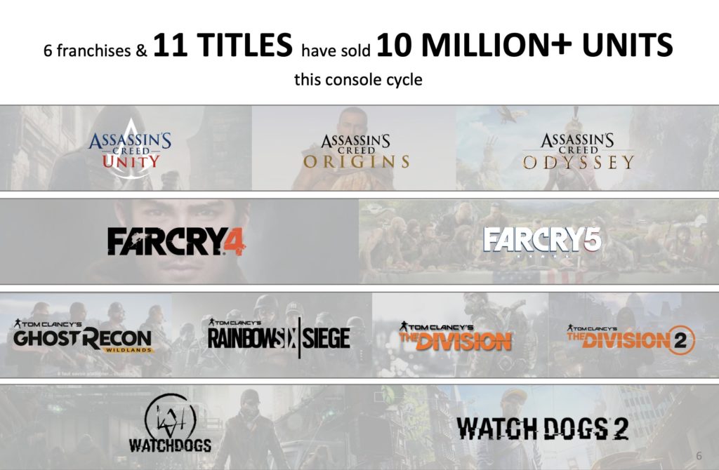 الإحدى عشرة عنوان يأتون من ستة سلاسل مختلفة لكن سلسلة آسسنز كريد هي أكثر سلسلة حققت مبيعات ليوبيسوفت هذا الجيل. بدون إطالة أكثر، إليكم القائمة الكاملة: